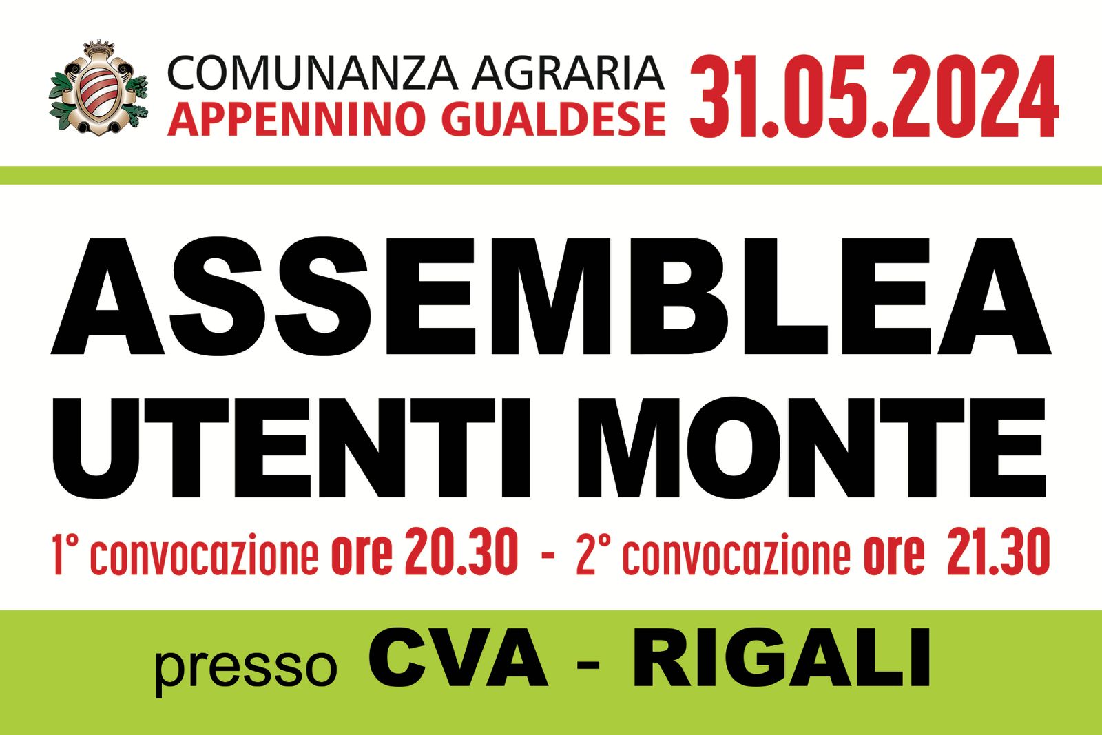 in data venerdì 31 maggio 2024, alle ore 20,30 in prima convocazione e alle ore 21,30 in seconda convocazione, presso il CVA di Rigali, L’Assemblea degli UTENTI MONTE, con il seguente ordine del giorno